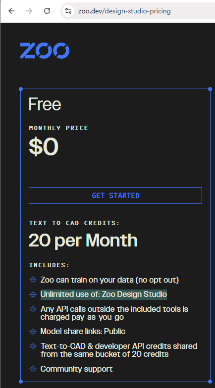 I believe the intent is for the Free plan to be good enough for hobbyists. As per the screenshot below, people who don’t need too many Text-to-CAD credits, want to use Zoo Design Studio primarily, and are fine with us training on the data going in and out of our APIs.