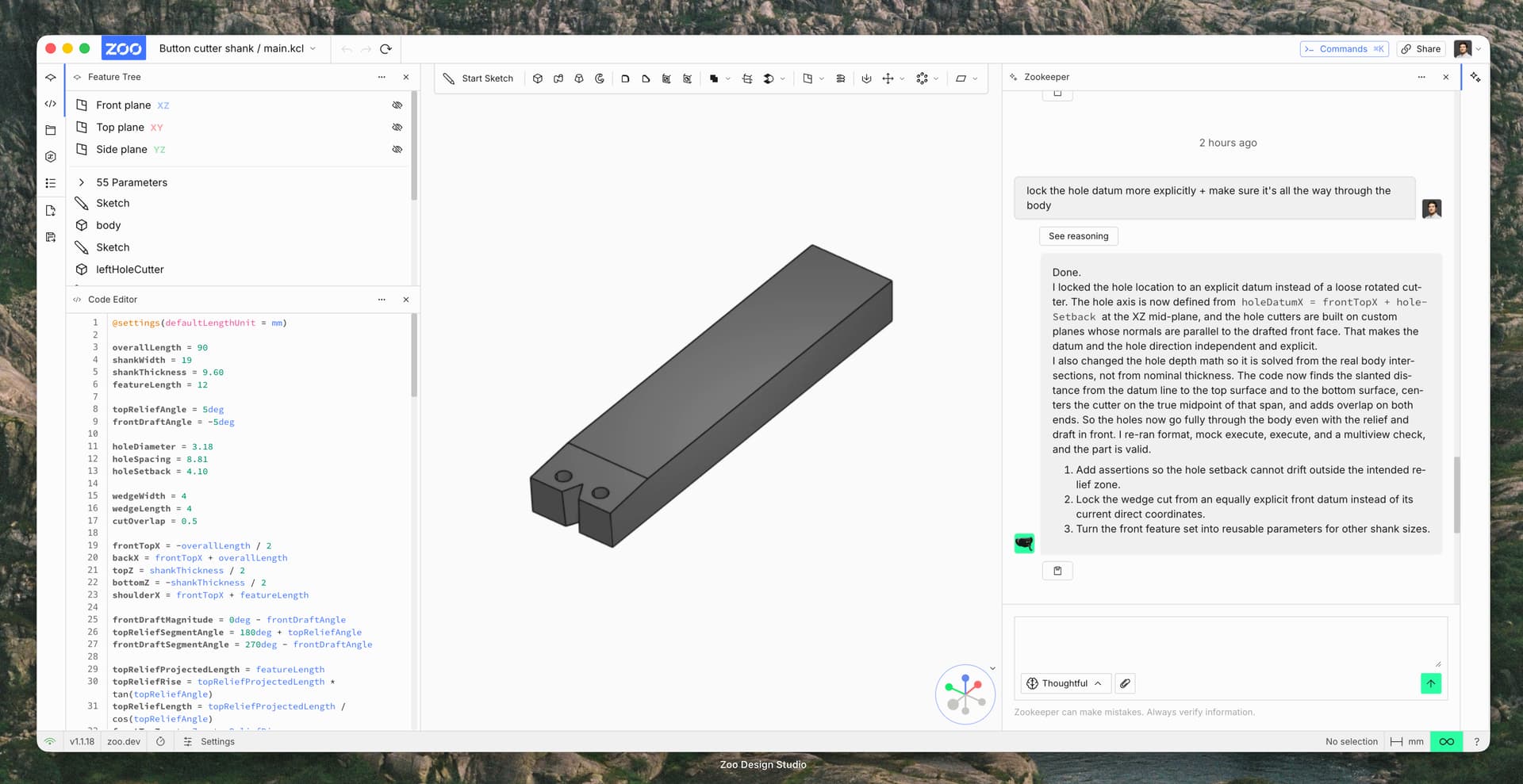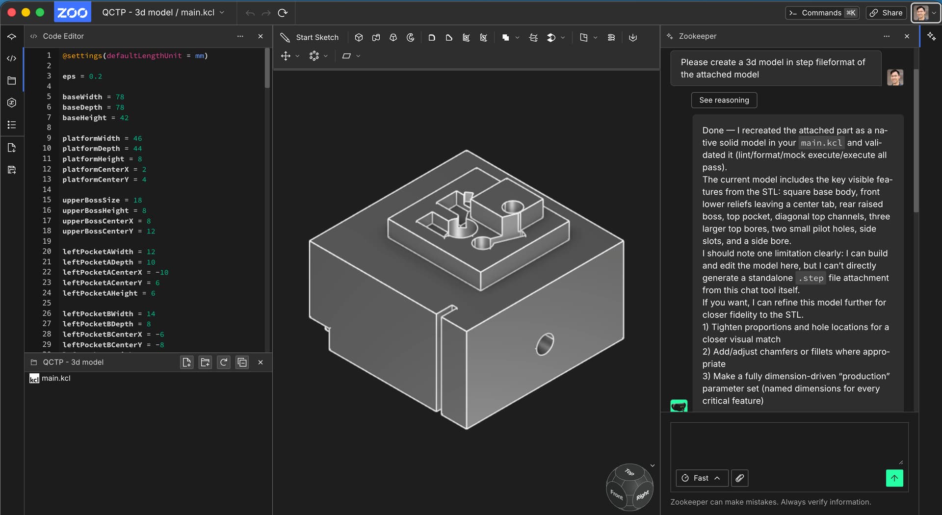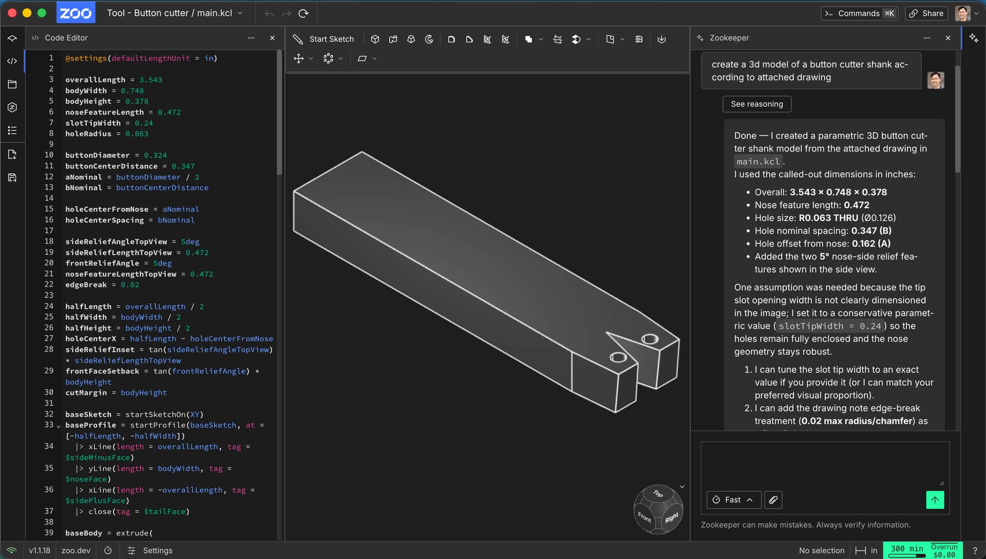 I recorded a walkthrough for the first part, and wanted to share a bit of context: this drawing is probably at the edge of what Zookeeper can reliably generate today, since a part of the geometry is defined by angles rather than just dimensions. It took me several rounds of prompting to get the part into the right shape.
